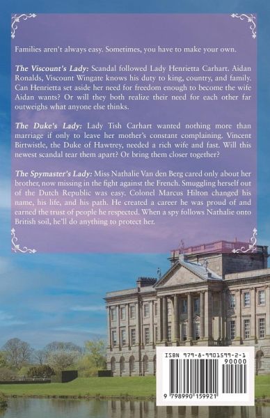 The Lady's Marquess Companion Series Trilogy Families aren't always easy. Sometimes, you have to make your own. The Viscount's Lady: Scandal followed Lady Henrietta Carhart. Aidan Ronalds, Viscount Wingate knows his duty to king, country, and family. Can Henrietta set aside her need for freedom enough to become the wife Aidan wants? Or will they both realize their need for each other far outweighs what anyone else thinks. The Duke's Lady: Lady Tish Carhart wanted nothing more than marriage if only to leave her mother's constant complaining. Vincent Birtwistle, the Duke of Hawtrey, needed a rich wife and fast. Will this newest scandal tear them apart? Or bring them closer together? The Spymaster's Lady: Miss Nathalie Van den Berg cared only about her brother, now missing in the fight against the French. Smuggling herself out of the Dutch Republic was easy. Colonel Marcus Hilton changed his name, his life, and his path. He created a career he was proud of and earned the trust of people he respected. When a spy follows Nathalie onto British soil, he'll do anything to protect her.