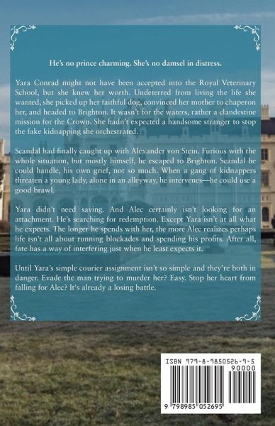 He's no prince charming. She's no damsel in distress. Yara Conrad might not have been accepted into the Royal Veterinary School, but she knew her worth. Undeterred from living the life she wanted, she picked up her faithful dog, convinced her mother to chaperon her, and headed to Brighton. It wasn't for the waters, rather a clandestine mission for the Crown. She hadn't expected a handsome stranger to stop the fake kidnapping she orchestrated. Scandal had finally caught up with Alexander von Stein. Furious with the whole situation, but mostly himself, he escaped to Brighton. Scandal he could handle, his own grief, not so much. When a gang of kidnappers threaten a young lady, alone in an alleyway, he intervenes-he could use a good brawl. Yara didn't need saving. And Alec certainly isn't looking for an attachment. He's searching for redemption. Except Yara isn't at all what he expects. The longer he spends with her, the more Alec realizes perhaps life isn't all about running blockades and spending his profits. After all, fate has a way of interfering just when he least expects it. Until Yara's simple courier assignment isn't so simple and they're both in danger. Evade the man trying to murder her? Easy. Stop her heart from falling for Alec? It's already a losing battle.