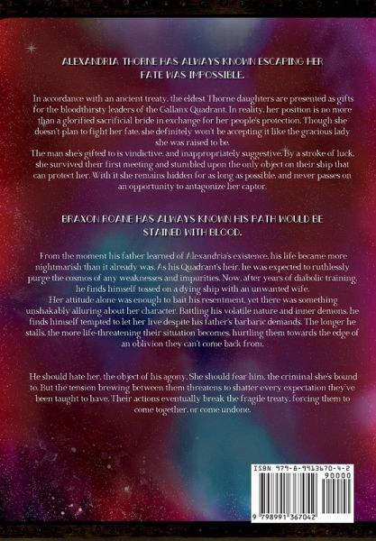 Alexandria Thorne has always known escaping her fate was impossible. In accordance with an ancient treaty, the eldest Thorne daughters are presented as gifts for the bloodthirsty leaders of the Gallanx Quadrant. In reality, her position is no more than a glorified sacrificial bride in exchange for her people's protection. Though she doesn't plan to fight her fate, she definitely won't be accepting it like the gracious lady she was raised to be. The man she's gifted to is vindictive, and inappropriately suggestive. By a stroke of luck, she survived their first meeting and stumbled upon the only object on their ship that can protect her. With it she remains hidden for as long as possible, and never passes on an opportunity to antagonize her captor. Braxon Roane has always known his path would be stained with blood. From the moment his father learned of Alexandria's existence, his life became more nightmarish than it already was. As his Quadrant's heir, he was expected to ruthlessly purge the cosmos of any weaknesses and impurities. Now, after years of diabolic training, he finds himself tossed on a dying ship with an unwanted wife. Her attitude alone was enough to bait his resentment, yet there was something unshakably alluring about her character. Battling his volatile nature and inner demons, he finds himself tempted to let her live despite his father's barbaric demands. The longer he stalls, the more life-threatening their situation becomes, hurtling them towards the edge of an oblivion they can't come back from. He should hate her, the object of his agony. She should fear him, the criminal she's bound to. But the tension brewing between them threatens to shatter every expectation they've been taught to have. Their actions eventually break the fragile treaty, forcing them to come together, or come undone. Please note this book is a Dark Romance, and a complete work of fiction. It should not be recreated in real life. Possible triggering elements include but are not limited to: -domestic abuse/threats of sexual violence -blurred consent lines -descriptions of physical torture/PTSD -murder, physical harm, and intimidation -various uses of weapons -explicit sexual scenes/BDSM elements -misogynistic, sexual, and foul language -allusions to various mental health disorders