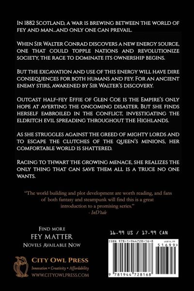 The year is 1882 Scotland, and the auld alliance betwixt king and fey has long been forgotten. Men of science, backed by barons of industry, push the boundaries of technology. When Sir Walter Conrad discovers a new energy source, one that could topple nations and revolutionize society, the race to dominate its ownership begins. But the excavation and use of this energy source will have dire consequences for both humans and fey. For an ancient enemy stirs, awakened by Sir Walter’s discovery. Outcast half-fey Effie of Glen Coe is the Empire’s only hope at averting the oncoming disaster. Effie finds herself embroiled in the conflict, investigating the eldritch evil spreading throughout the Highlands. As she struggles against the greed of mighty lords and to escape the clutches of the queen’s minions, her comfortable world is shattered. Racing to thwart the growing menace, she realizes the only thing that can save them all is a truce no one wants.