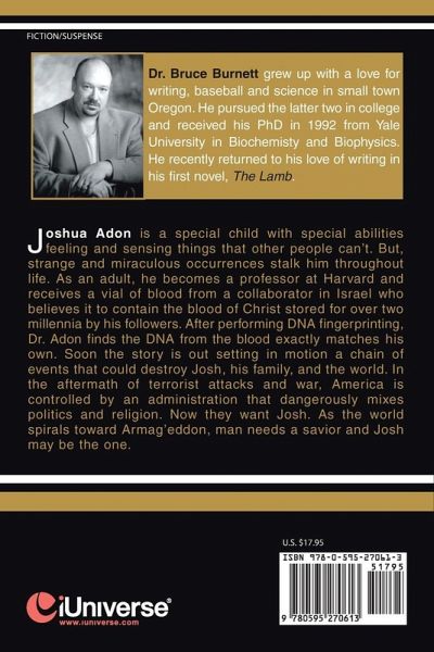 Joshua Adon is a special child with special abilities, feeling and sensing things that other people can't. But, strange and miraculous occurrences stalk him throughout life. As an adult, he becomes a professor at Harvard and receives a vial of blood from a collaborator in Israel who believes it to contain the blood of Christ stored for over two millennia by his followers. After performing DNA fingerprinting, Dr. Adon finds the DNA from the blood exactly matches his own. Soon the story is out setting in motion a chain of events that could destroy Josh, his family, and the world. In the aftermath of terrorist attacks and war, America is controlled by an administration that dangerously mixes politics and religion. Now they want Josh. As the world spirals toward Armageddon, the world needs a savior and Josh may be the one.
