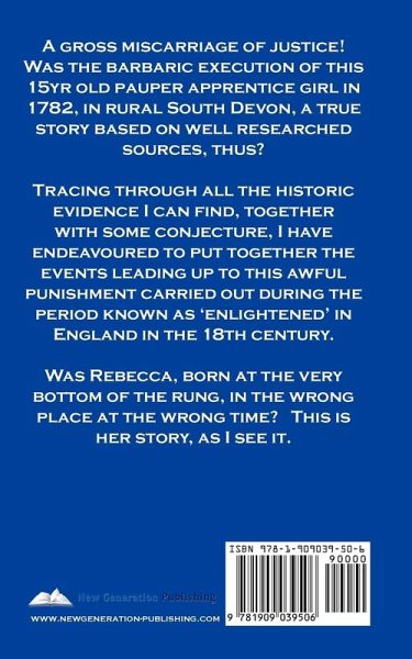 A gross miscarriage of justice! Was the barbaric execution of this 15yr old pauper apprentice girl in 1782, in rural South Devon, a true story based on well researched sources, thus? Tracing through all the historic evidence I can find, together with some conjecture, I have endeavoured to put together the events leading up to this awful punishment carried out during the period known as 'enlightened' in England in the 18th century. Was Rebecca, born at the very bottom of the rung, in the wrong place at the wrong time? This is her story, as I see it.