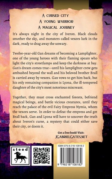 A cursed city. A young warrior. A magical journey. It's always night in the city of Iveron. Black clouds smother the sky, and monsters called vexors lurk in the dark, ready to drag away the unwary. Twelve-year-old Gan dreams of becoming a Lamplighter, one of the young heroes with their flaming spears who light the city's streetlamps and keep the darkness at bay. Gan's dream comes true-until his lamplighter crew gets ambushed beyond the wall and his beloved brother Brall is carried away by vexors. Gan vows to get him back, but his only remaining companion is Lyona, the ill-tempered daughter of the city's most notorious miscreant. Together, they must cross enchanted forests, befriend magical beings, and battle viscous creatures, until they reach the palace of the evil Fairy Empress Nymia, whom the vexors serve. In order to defeat the empress and get Brall back, Gan and Lyona will have to uncover the truth about Iveron's curse, a mystery that could either save their city, or doom it. Reviews I enjoyed every minute of The Lamplighters... It is a perfect middle grade story... fast-paced and will keep you glued to the edge of your seat. - Jacci Turner, Author of The Finding Home Series In J. Gabriel's The Lamplighters, I found everything I enjoy in middle grade fantasy (or any fantasy)... It kept me reading until late into the night and now I want all my kids to read it too. - Jean Knight Pace, author of The Determiner This book has adventure, mythical creatures, a fun magic system, and is a real page turner... a great middle grade book that gave me Percy Jackson vibes... 10/10 would recommend. - Céline Y, Goodreads Reviewer This middle grade novel was utterly captivating... filled with nostalgia, adventure, and a good helping of hope. [Five Stars] - Ellie E, Bookstagram Reviewer @sidetracked95