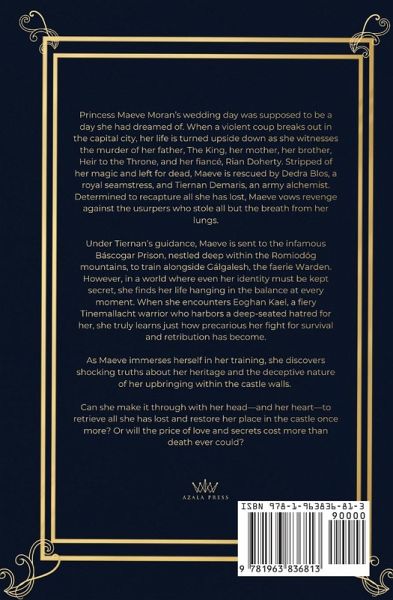 Princess Maeve Moran's wedding day was supposed to be a day she had dreamed of. When a violent coup breaks out in the capital city, her life is turned upside down as she witnesses the murder of her father, The King, her mother, her brother, Heir to the Throne, and her fiancé, Rian Doherty. Stripped of her magic and left for dead, Maeve is rescued by Dedra Blos, a royal seamstress, and Tiernan Demaris, an army alchemist. Determined to recapture all she has lost, Maeve vows revenge against the usurpers who stole all but the breath from her lungs. Under Tiernan's guidance, Maeve is sent to the infamous Báscogar Prison, nestled deep within the Romiodóg mountains, to train alongside Gálgalesh, the faerie Warden. However, in a world where even her identity must be kept secret, she finds her life hanging in the balance at every moment. When she encounters Eoghan Kael, a fiery Tinemallacht warrior who harbors a deep-seated hatred for her, she truly learns just how precarious her fight for survival and retribution has become. As Maeve immerses herself in her training, she discovers shocking truths about her heritage and the deceptive nature of her upbringing within the castle walls. Can she make it through with her head-and her heart-to retrieve all she has lost and restore her place in the castle once more? Or will the price of love and secrets cost more than death ever could?