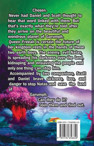 Chosen. Daniel and Scott never thought that would be them. But when they find a mysterious spaceship in the woods and are flown to another world filled with magical creatures, that's exactly what they've been. The land of Garumph is in danger. Queen Freeah sends them on a quest to discover the key to defeating evil Natas--before he destroys the entire world! Friendships will be tested. Dangerous will be faced. Truths will be revealed. An adventure of a lifetime awaits Daniel and Scott as they journey through incredible lands, meeting new friends and making enemies along the way. This book will take you and your child on a journey of several spiritual lessons, including the presence of God in every situation, forgiveness, trust, and loyalty.