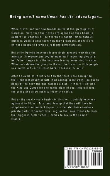 Being small sometimes has its advantages... When Clover and her new friends arrive at the giant gates of Gargaton, more than their eyes are opened as they begin to explore the wonders of the oversize kingdom. When curious princess Ophelia asks them how they procreate, the trio are only too happy to provide a real-life demonstration. But while Ophelia becomes increasingly aroused watching the amorous threesome and begins moaning in mounting pleasure, her father barges into the bedroom fearing something is amiss. When he catches the group in the act, he traps the little people in a bottle and carries them back to his master suite. After he explains to his wife how the three were corrupting their innocent daughter with their concupiscent ways, the queen peers at the sexy trio and hatches a plan. If they will service the King and Queen for one randy night of sex, they will free the group and allow them to leave the castle. But as the royal couple begins to disrobe, it quickly becomes apparent to Clover, Tara, and Jessop that they will have to adopt some creative techniques to stimulate their enormous private parts. It doesn't take long for the three friends to learn that bigger is better when it comes to sex in the Land of Giants....