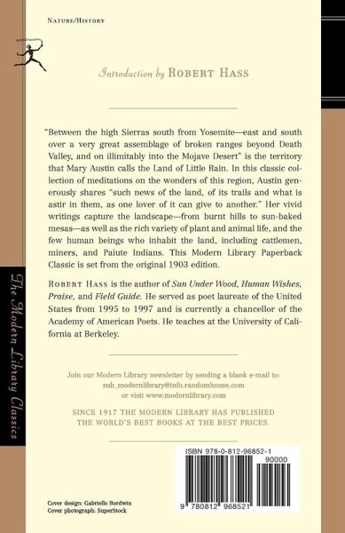 "Between the high Sierras south from Yosemite—east and south over a very great assemblage of broken ranges beyond Death Valley, and on illimitably into the Mojave Desert” is the territory that Mary Austin calls the Land of Little Rain. In this classic collection of meditations on the wonders of this region, Austin generously shares "such news of the land, of its trails and what is astir in them, as one lover of it can give to another.” Her vivid writings capture the landscape—from burnt hills to sun-baked mesas—as well as the rich variety of plant and animal life, and the few human beings who inhabit the land, including cattlemen, miners, and Paiute Indians. This Modern Library Paperback Classic is set from the original 1903 edition.