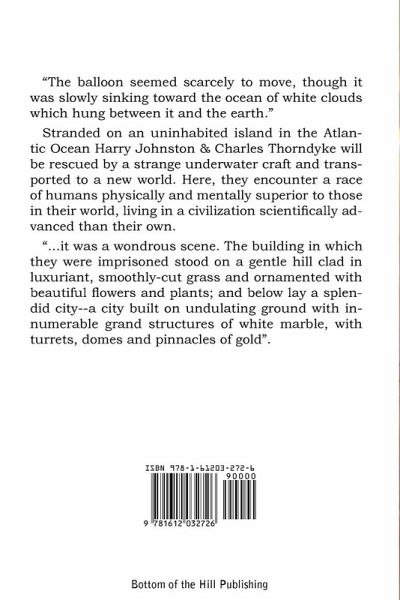 "The balloon seemed scarcely to move, though it was slowly sinking toward the ocean of white clouds which hung between it and the earth." Stranded on an uninhabited island in the Atlantic Ocean Harry Johnston & Charles Thorndyke will be rescued by a strange underwater craft and transported to a new world. Here, they encounter a race of humans physically and mentally superior to those in their world, living in a civilization scientifically advanced than their own. "...it was a wondrous scene. The building in which they were imprisoned stood on a gentle hill clad in luxuriant, smoothly-cut grass and ornamented with beautiful flowers and plants; and below lay a splendid city--a city built on undulating ground with innumerable grand structures of white marble, with turrets, domes and pinnacles of gold".