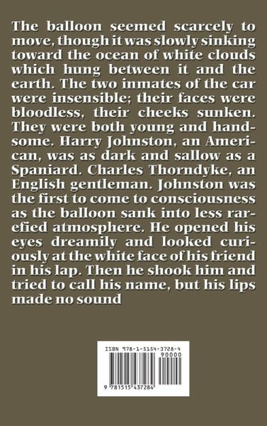 The balloon seemed scarcely to move, though it was slowly sinking toward the ocean of white clouds which hung between it and the earth. The two inmates of the car were insensible; their faces were bloodless, their cheeks sunken. They were both young and handsome. Harry Johnston, an American, was as dark and sallow as a Spaniard. Charles Thorndyke, an English gentleman. Johnston was the first to come to consciousness as the balloon sank into less rarefied atmosphere