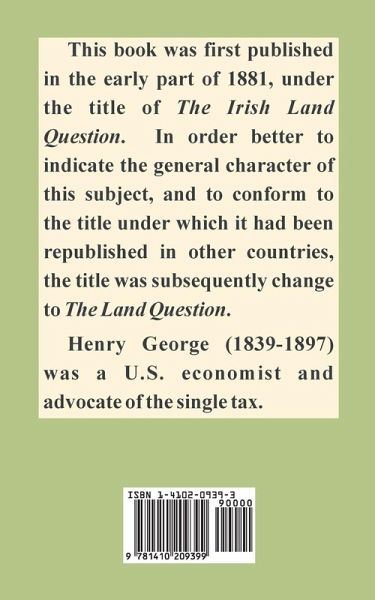 This book was first published in the early part of 1881, under the title of The Irish Land Question. In order better to indicate the general character of this subject, and to conform to the title under which it had been republished in other countries, the title was subsequently change to The Land Question. Henry George (1839-1897) was a U.S. economist and advocate of the single tax.