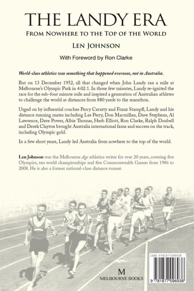World-class athletics was something that happened overseas, not in Australia. And then, on 13 December 1952, John Landy ran a mile at Melbourne's Olympic Park in four minutes 2.1 seconds. In those few minutes he re-ignited the race for the sub-four minute mile and inspired a generation of Australian athletes to challenge the world at distances from 880 yards to the marathon. Others, notably the charismatic coach Percy Cerutty, and Landy's Helsinki Olympics teammates Don Macmillan and Les Perry, played significant roles in this flowering of talent. Following Landy, Herb Elliott rose to the top, winning the 1500 metres at the 1960 Rome Olympics, smashing the world record. From 1954 to 1968, Landy, Dave Stephens, Elliott, Albie Thomas, Ron Clarke and Ralph Doubell broke world records. Elliott and Doubell became Olympic champions; Landy, Al Lawrence, Dave Power and Clarke took Olympic medals. Derek Clayton set world records in the marathon. Pat Clohessy, on whom Landy was a formative influence, coached Robert de Castella to a world championships gold medal in the marathon. John Landy was not the only influence, but it was undeniably his era; he was its first, and greatest, star and he directly inspired and advised many of the subsequent athletes and coaches. He led Australia form nowhere to the top of the world.