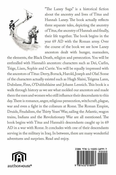 "The Laney Saga" is an historical fiction about the ancestry and lives of Titus and Hannah Laney. The book is actually three books, depicting the ancestry of Titus, the ancestry of Hannah and finally, their life together. The book begins in the year 69 AD with the Roman army. Over the course of the next 300 pages we see how Laney ancestors dealt with hunger, marauders, the elements, the Black Death, religion, and persecution. You will be enthralled with Hannah's ancestors: characters such as Dei, Carlin, Teige, Liam, Sophie and Carrie. You will be equally impressed with the ancestors of Titus: Derry, Boruck, Harold, Joseph and Olaf. Some of the characters actually existed such as Hugh Slaini, Teigena Lann, Dubslane, Finn, O'Dubhshlaine and Johann Lennich. This book is a walk through history as we see what molded our ancestors and made them the men and women that still influences their descendants to this day. There is romance, anger, religious persecution, witchcraft, plague, war and even a fight in the coliseum at Rome. The Roman Empire, Druids, Feudalism, the Thirty Years' War, sailing the Atlantic, wagon trains, Indians and the Revolutionary War are all mentioned. The book begins with Titus and Hannah's ancestors caught up in 69 AD in a war with Rome. It concludes with one of their ancestors serving in the military in Iraq. And in between, there are many wonderful adventures and surprises. Read and enjoy.
