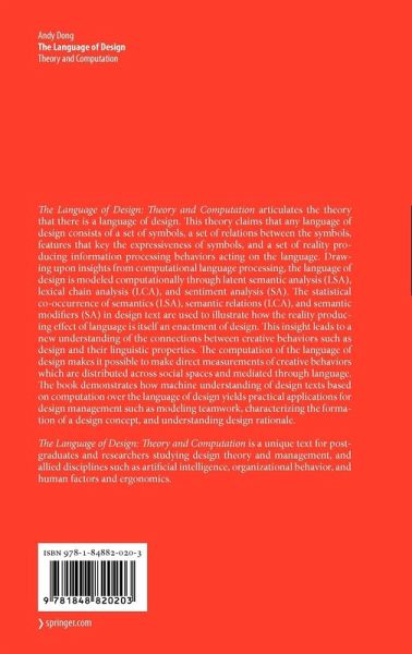 "The Language of Design" articulates the theory that there is a language of design. Drawing upon insights from computational language processing, the language of design is modeled computationally through latent semantic analysis (LSA), lexical chain analysis (LCA), and sentiment analysis (SA). The statistical co-occurrence of semantics (LSA), semantic relations (LCA), and semantic modifiers (SA) in design text is used to illustrate how the reality producing effect of language is itself an enactment of design, allowing a new understanding of the connections between creative behaviors. The computation of the language of design makes it possible to make direct measurements of creative behaviors which are distributed across social spaces and mediated through language. The book demonstrates how machine understanding of design texts based on computation over the language of design yields practical applications for design management.