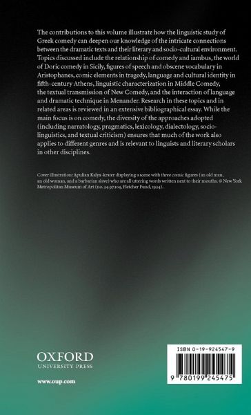 The contributions to this volume illustrate how the linguistic study of Greek comedy can deepen our knowledge of the intricate connections between the dramatic texts and their literary and socio-cultural environment. Topics discussed include the relationship of comedy and iambus, the world of Doric comedy in Sicily, figures of speech and obscene vocabulary in Aristophanes, comic elements in tragedy, language and cultural identity in fifth-century Athens, linguistic characterization in Middle Comedy, the textual transmission of New Comedy, and the interaction of language and dramatic technique in Menander. Research in these topics and in related areas is reviewed in an extensive bibliographical essay. While the main focus is on comedy, the diversity of the approaches adopted (including narratology, pragmatics, lexicology, dialectology, sociolinguistics, and textual criticism) ensures that much of the work applies to different genres and is relevant also to linguists and literary scholars.