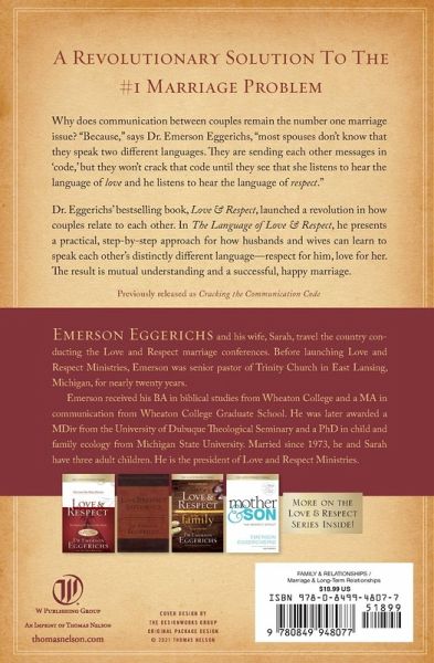 An in-depth study of why your communication styles are not wrong, just different! Finally an answer for the number one problem in marriages-communication! This analysis of the vital principles of cross-gender communication helps couples recognize they speak two different languages. They are sending each other messages in "code" but won't be able to crack that code until they realize that "she" listens to hear the language of love and ""he"" listens for respect. Most advice on this subject fails to understand that husbands and wives are wired very differently, and when those wires get crossed, the communication sparks can fly! Dr. Eggerich's best-selling book, "Love and Respect," launched a revolution in how couples relate to each other. In "The Language of Love and Respect "he shares how that message can be applied. Formerly titled "Cracking the Communication Code."