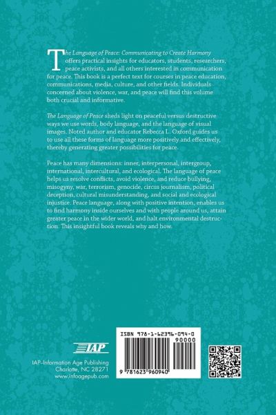 The Language of Peace: Communicating to Create Harmony offers practical insights for educators, students, researchers, peace activists, and all others interested in communication for peace. This book is a perfect text for courses in peace education, communications, media, culture, and other fields. Individuals concerned about violence, war, and peace will find this volume both crucial and informative. This book sheds light on peaceful versus destructive ways we use words, body language, and the language of visual images. Noted author and educator Rebecca L. Oxford guides us to use all these forms of language more positively and effectively, thereby generating greater possibilities for peace. Peace has many dimensions: inner, interpersonal, intergroup, international, intercultural, and ecological. The language of peace helps us resolve conflicts, avoid violence, and reduce bullying, misogyny, war, terrorism, genocide, circus journalism, political deception, cultural misunderstanding, and social and ecological injustice. Peace language, along with positive intention, enables us to find harmony inside ourselves and with people around us, attain greater peace in the wider world, and halt environmental destruction. This insightful book reveals why and how.