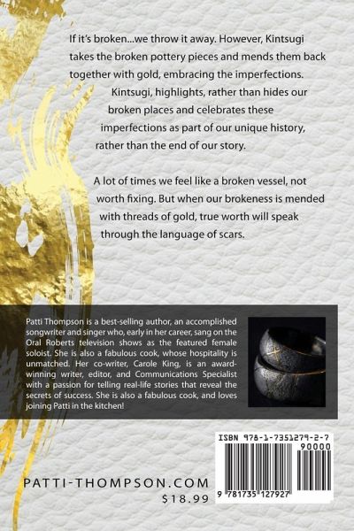 Are you still trying to figure out what went wrong with your life? Was it a job loss that started the downward spiral you feel helpless to escape? Was it divorce? Was it abuse? Perhaps it was the death of a loved one, someone without whom your world no longer makes sense? Life-changing losses slash across our souls and leave gaping wounds, wounds whose scars imprint our once-perfect world as boldly as a jet's bright contrail cuts across a perfectly blue sky. Broken, lost, and scarred, how do we begin again? Patti Roberts-Thompson and Carole Lynn King consider this question through the lens of the extraordinary personal experiences of Patti's memoir, The Language of Scars, grounding life lessons in solid biblical truths. The Language of Scars, a language of lived wisdom, emerges in our conversations when suffering, doing its perfect work, brings us to humility. Humility brings us to redemption, and redemption brings us to the river of Grace, where healing washes us and others as it flows over and through our lives. In ancient Japan, an art form known as Kintsugi sprung from a legendary story of the appeasement of an angry Shogun. The Shogun's favorite teacup was broken to pieces by a careless servant. To save the servant's life, the artisans of the court used liquid gold to glue the pieces back together, in hopes the cup would be even better than before. After gluing it back together with gold, the artisans burnished the cup to a fine glow, and discovered gleaming gold designs that could never be repeated or copied. The cup had become a one-of-a-kind piece of art. The Shogun was delighted, and a new art form was born. It is the same with us and the Language of Scars. Kintsugi creates art from what is broken in us. God's golden glue gleams along our fault lines, creating an intricate design unique to every restored life. When we bring our broken pieces to the Creator and Redeemer of our souls, our broken places become an intersection with grace, a place where His golden love and healing put us back together again, even better than before. "I am one of the Lord's many pieces of Kintsugi," Patti says. "Are you? Let Christ have your broken places, and he will make them gleam with His light. Kintsugi of the soul belongs to all who seek it. Are you ready? This is what redemption looks like. It is Christ who heals, Christ who makes our scars beautiful and increases our value to others through them. Let Him create art from your broken places; Let Him teach you the Language of Scars.