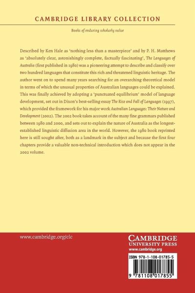 Described by Ken Hale as 'nothing less than a masterpiece' and by P. H. Matthews as 'absolutely clear, astonishingly complete, factually fascinating', The Languages of Australia (first published in 1980 and now reissued) was a landmark in Australian linguistics. This pioneering work of synthesis covered more than two hundred Aboriginal languages, and stimulated the next generation of scholarship in the field. The author's subsequent search for an overarching theoretical model to explain the unusual properties of Australian languages finally led him to adopt a 'punctuated equilibrium' model of language development. Dixon proposed this in The Rise and Fall of Languages (1997), which provided the framework for his major work Australian Languages: Their Nature and Development (2002). The Languages of Australia is still sought after, however, as a benchmark in the discipline and because its first four chapters provide a valuable non-technical introduction that does not appear in the 2002 volume.