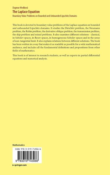 This book is devoted to boundary value problems of the Laplace equation on bounded and unbounded Lipschitz domains. It studies the Dirichlet problem, the Neumann problem, the Robin problem, the derivative oblique problem, the transmission problem, the skip problem and mixed problems. It also examines different solutions - classical, in Sobolev spaces, in Besov spaces, in homogeneous Sobolev spaces and in the sense of non-tangential limit. It also explains relations between different solutions.