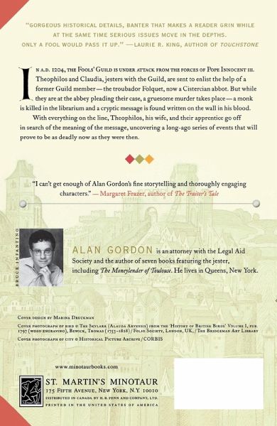 In 1204 A.D., the Fools' Guild is under attack from the forces of Pope Innocent III. Theophilos and Claudia, jesters with the Guild, are sent to enlist the help of a former guild member - the troubador Folquet, now a Cistercian abbot. But while they are at the abbey pleading their case, a gruesome murder takes place - a monk is killed in the librarium and a cryptic message written on the wall in his blood. With everything on the line, Theophilos, his wife, and their apprentice go off in search of the meaning of the message, uncovering a long-ago series of events that will prove to be as deadly now as they were then.