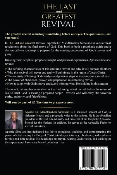 The Last and Greatest Revival The greatest revival in history is unfolding before our eyes. The question is-are you ready? In The Last and Greatest Revival, Apostle Dr. Mandlenkhosi Simelane unveils critical revelations about the final move of God. With over 40 years of teaching and ministering, the Apostle has been entrusted with a divine message-a call to prepare for the greatest revival the world has ever seen. This book serves as both a prophetic guide and a roadmap to help believers align with God's plan for this historic outpouring of His power and glory.What You Will Discover in This Book:The defining characteristics of this end-time revival-why it will surpass all others and never end. The necessity of confrontation-how revival is a battle between truth and deception. How to hear God clearly-practical steps to sharpen your spiritual ears and walk in divine direction. The price of revival-why true revival requires obedience, prayer, and unwavering faith. The role of young people-God's divine plan to use them as the driving force of this great awakening. The formation of Christ in man-why preparing for revival means being transformed into His likeness to carry His presence. The power of the Word-why immersion in Scripture is the foundation for sustaining revival. The coming Prophetic Fire Revival-a move of God where supernatural miracles, signs, and wonders will be undeniable. This is not just another revival-it is the final and greatest revival before the return of Jesus Christ. God is seeking prepared vessels-men and women who will carry His power in purity, authority, and faithfulness. Will you be part of it? The time to prepare is now. Get your copy today and step into the greatest move of God the world has ever seen!