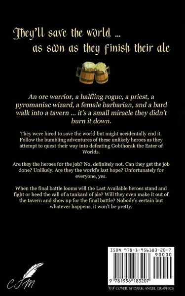 An orc warrior, a halfling rogue, a priest, a pyromaniac wizard, a female barbarian, and a bard walk into a tavern ... it's a small miracle they didn't burn it down. They were hired to save the world but might accidentally end it. Follow the bumbling adventures of these unlikely heroes as they attempt to quest their way into defeating Gobthorak the Eater of Worlds. Are they the heroes for the job? No, definitely not. Can they get the job done? Unlikely. Are they the world's last hope? Unfortunately for everyone, yes. When the final battle looms will the Last Available heroes stand and fight or heed the call of a tankard of ale? Will they even make it out of the tavern and show up for the final battle? Nobody's certain but whatever happens, it won't be pretty.