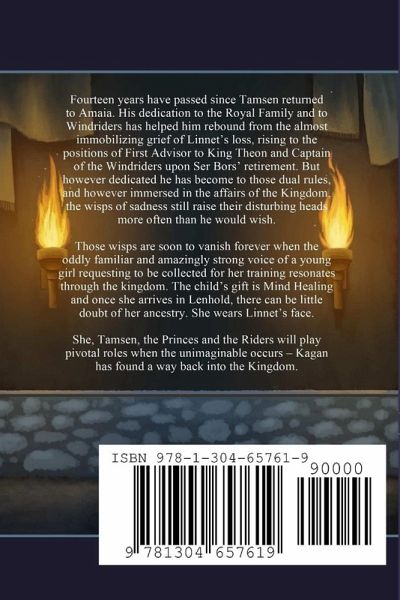 BOOK III: Fourteen years have passed since Tamsen returned to Amaia. His dedication to the Royal Family and to Windriders has helped him rebound from the almost immobilizing grief of Linnet's loss, rising to the positions of First Advisor to King Theon and Captain of the Windriders upon Ser Bors' retirement. But however dedicated he has become to those dual rules, and however immersed in the affairs of the Kingdom, the wisps of sadness still raise their disturbing heads more often than he would wish. But those wisps are soon to vanish forever when the oddly familiar and amazingly strong voice of a young girl requesting to be collected for her training resonates through the kingdom. The child's gift is Mind Healing and once she arrives in Lenhold, there can be little doubt of her ancestry. She wears Linnet's face. She, Tamsen, the Princes and the Riders will play pivotal roles when the unimaginable occurs - Kagan has found a way back into the Kingdom.