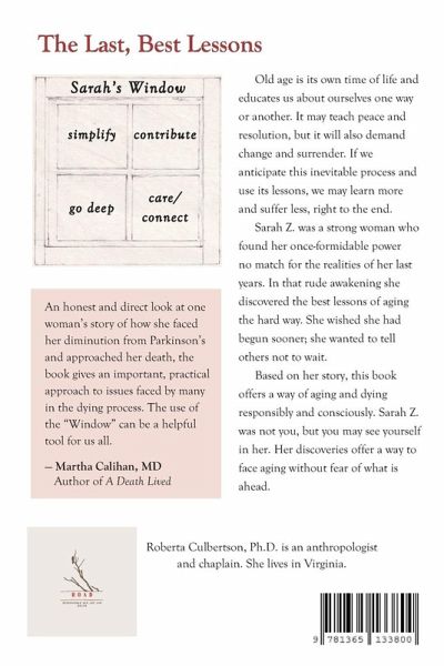 A way to age and die responsibly for the sake of caregivers, family, and the planet. Based on the painful but also redeeming experiences of "Sarah Z.", The Last, Best Lessons creates a framework for conscious aging called "Sarah's Window. Using Sarah's Window, aging and dying can become a holistic process based on simplifying expectations; contributing by taking on ancient responsibilities of the aging; going deep into one's own life story and unfulfilled desires; and caring and connecting all the way until the end of life. For people in the earlier stages of aging and their families, the book is both a story of what happens when the facts of aging into death are not thought through, and also ways to prepare for them so as to live and die with dignity and peace of mind.