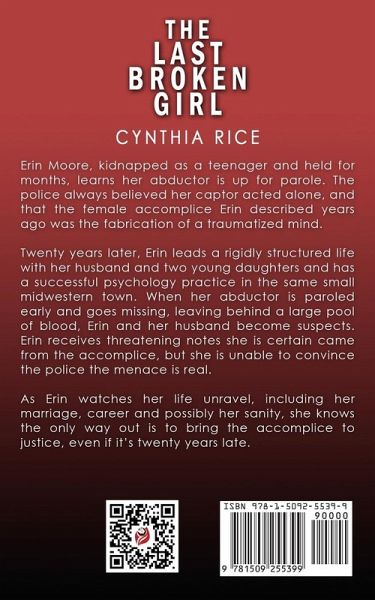 Erin Moore, kidnapped as a teenager and held for months, learns her abductor is up for parole. The police always believed her captor acted alone, and that the female accomplice Erin described years ago was the fabrication of a traumatized mind. Twenty years later, Erin leads a rigidly structured life with her husband and two young daughters and has a successful psychology practice in the same small midwestern town. When her abductor is paroled early and goes missing, leaving behind a large pool of blood, Erin and her husband become suspects. Erin receives threatening notes she is certain came from the accomplice, but she is unable to convince the police the menace is real. As Erin watches her life unravel, including her marriage, career and possibly her sanity, she knows the only way out is to bring the accomplice to justice, even if it's twenty years late.
