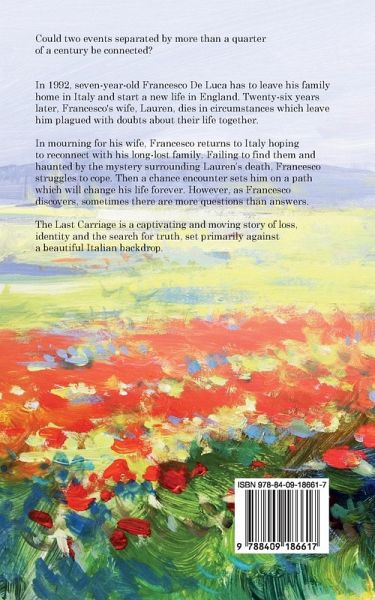 Having been forced to leave his father, sister and home town of Rome at the age of seven, Francesco De Luca grows up in England, never fully understanding why he was parted from his family. Twenty-six years later, Francesco's wife, Lauren, dies in circumstances which leave him plagued with doubts about their life together. In mourning for his wife, Francesco returns to Italy hoping to reconnect with his long-lost family. Failing to find them and haunted by the mystery surrounding Lauren’s death, Francesco struggles to cope. Then a chance encounter sets him on a path which will change his life forever. However, as Francesco discovers, sometimes there are more questions than answers. The Last Carriage is a captivating and moving story of loss, identity and the search for truth set primarily against a beautiful Italian backdrop.