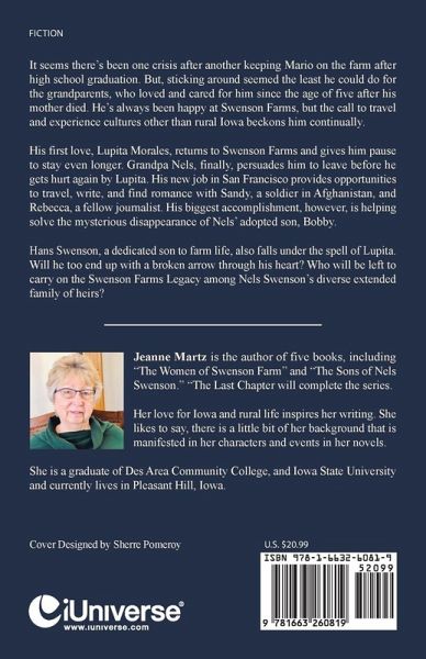 This novel is the third in a series of the Swenson Farm mysteries. Will Swenson Farm be left in capable hands when Nels Swenson is gone? Grandson, Mario Fontanini, narrates The Last Chapter, which promises to be an intriguing tale of romance and mystery in his quest to leave Iowa and establish a career in San Franciso. His first love, Lupita Morales, returns to Swenson Farm and gives him pause to stay, but Grandpa Nels persuades him to leave before he gets hurt by Lupita again. His journey to the big city opens up opportunities to travel, write, experience new cultures, and meet a girl named, Sandy, in Afghanistan, and a promising romance with Rebecca, a fellow journalist. His biggest accomplishment is helping solve the mysterious disappearance of Nels's adopted son, Bobby. Hans Swenson, a dedicated son to farm life, falls under the spell of Lupita Moralas. Will he too end up with a broken arrow through his heart? With only one biological heir, who will be left standing to carry on the Swenson Farms Legacy?