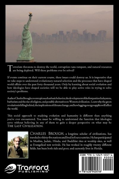 Terrorism threatens to destroy the world, corruption runs rampant, and natural resources are being depleted. Will these problems ever be solved? If events continue on their current course, these issues could destroy us. It is imperative that we take steps to understand evolutionary natural selection and the processes that have shaped world affairs over the past forty thousand years. Only by learning about social evolution and how ideologies have shaped societies will we be able to play active roles in trying to solve society's problems. Author Charles Brough covers topics such as basic behavior, the development of the first patriarchal system, barbarism and the rise of religions, and possible alternatives to Western civilization. Learn why the green revolution is falling behind, the implications of climate change, and how lagging energy supplies will affect the world. This social approach to studying evolution and humanity is different than anything you've ever encountered. You must be willing to understand the function that ideologies serve without believing in any of them to gain a deeper perspective on what may be The Last Civilization.