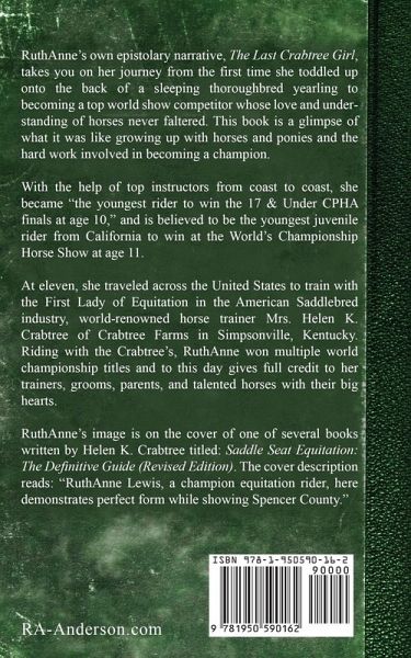 RuthAnne's own epistolary narrative, The Last Crabtree Girl, takes you on her journey from the first time she toddled up onto the back of a sleeping thoroughbred yearling to becoming a top world show competitor whose love and understanding of horses never faltered. This book is a glimpse of what it was like growing up with horses and ponies and the hard work involved in becoming a champion. With the help of top instructors from coast to coast, she became "the youngest rider to win the 17 & Under CPHA finals at age 10" and is believed to be the youngest juvenile rider from California to win at the World's Championship Horse Show at age 11. At eleven, she traveled across the United States to train with the First Lady of Equitation in the American Saddlebred industry, world-renowned horse trainer Mrs. Helen K. Crabtree of Crabtree Farms in Simpsonville, Kentucky. Riding with the Crabtree's, RuthAnne won multiple world championship titles and to this day gives full credit to her trainers, grooms, parents, and talented horses with their big hearts. RuthAnne's image is on the cover of one of several books written by Helen K. Crabtree titled: Saddle Seat Equitation: The Definitive Guide (Revised Edition). The cover description reads: "RuthAnne Lewis, a champion equitation rider, here demonstrates perfect form while showing Spencer County."