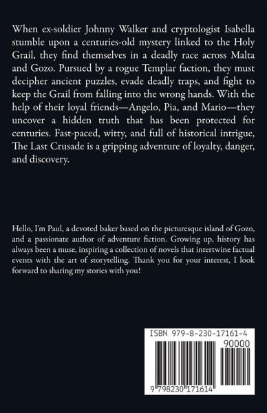 When ex-soldier Johnny Walker and cryptologist Isabella stumble upon a centuries-old mystery linked to the Holy Grail, they find themselves in a deadly race across Malta and Gozo. Pursued by a rogue Templar faction, they must decipher ancient puzzles, evade deadly traps, and fight to keep the Grail from falling into the wrong hands. With the help of their loyal friends-Angelo, Pia, and Mario-they uncover a hidden truth that has been protected for centuries. Fast-paced, witty, and full of historical intrigue, The Last Crusade is a gripping adventure of loyalty, danger, and discovery.
