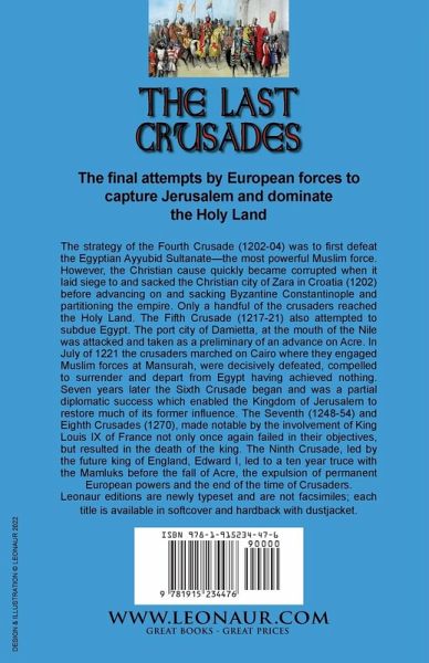 The final attempts by European forces to capture Jerusalem and dominate the Holy Land The strategy of the Fourth Crusade (1202-04) was to first defeat the Egyptian Ayyubid Sultanate-the most powerful Muslim force. However, the Christian cause quickly became corrupted when it laid siege to and sacked the Christian city of Zara in Croatia (1202) before advancing on and sacking Byzantine Constantinople and partitioning the empire. Only a handful of the crusaders reached the Holy Land. The Fifth Crusade (1217-21) also attempted to subdue Egypt. The port city of Damietta, at the mouth of the Nile was attacked and taken as a preliminary of an advance on Acre. In July of 1221 the crusaders marched on Cairo where they engaged Muslim forces at Mansurah, were decisively defeated, compelled to surrender and depart from Egypt having achieved nothing. Seven years later the Sixth Crusade began and was a partial diplomatic success which enabled the Kingdom of Jerusalem to restore much of its former influence. The Seventh (1248-54) and Eighth Crusades (1270), made notable by the involvement of King Louis IX of France not only once again failed in their objectives, but resulted in the death of the king. The Ninth Crusade, led by the future king of England, Edward I, led to a ten year truce with the Mamluks before the fall of Acre, the expulsion of permanent European powers and the end of the time of Crusaders. Leonaur editions are newly typeset and are not facsimiles; each title is available in softcover and hardback with dustjacket.