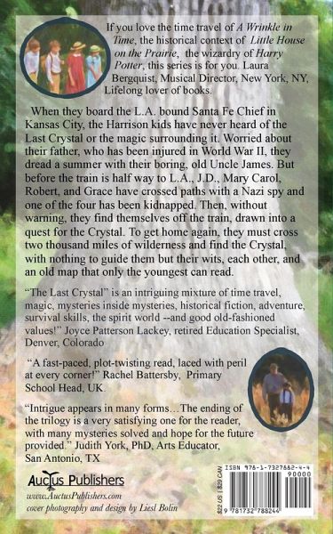 When they board the L.A. bound Santa Fe Chief in Kansas City, the Harrison kids have never heard of the Last Crystal or the magic surrounding it. Worried about their father, who has been injured in World War II, they dread a summer with their boring, old Uncle James. But before the train is half way to L.A., J.D., Mary Carol, Robert, and Grace have crossed paths with a Nazi spy and one of the four has been kidnapped. Then, without warning, they find themselves off the train, drawn into a quest for the Crystal. To get home again, they must cross two thousand miles of wilderness and find the Crystal, with nothing to guide them but their wits, each other, and an old map that only the youngest can read. Winner of 2019 Agatha Award for Best Middle Grade/Young Adult Mystery