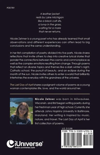 Nicole Zehner was born in Milwaukee, Wisconsin, and first began writing poetry during her freshman year of high school. Currently she attends Johns Hopkins University in Baltimore, Maryland. Her writing is inspired by music, nature, and travel. The Last Day of April is her first collection of poems.