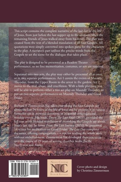 This script contains the complete narrative of the last day of the life of Jesus, from just before the last supper up to the moment when the remaining friends of Jesus walked away from his tomb. The play was created from the text of a blended translation of all four Gopels. All quotations were simply converted into spoken parts for the characters in the play. A narrator's part utilizes the precise words from the Gospels to set the scene for the dialogue that takes place. The play is designed to be presented as a Readers Theater performance, so no costumes, sets, or line memorization are required. Separated into 2 Acts, the play may either be presented all at once, or in two separate performances. Act 1 covers the events of Maundy Thursday, from the Upper Room to the arrest in the garden. Act 2 moves to the trial, abuse, and crucifixion. With a little planning you will be able to perform either a 2 Act play on Maundy Thursday, or put on or 2 separate performances on Maundy Thursday and Good Friday.