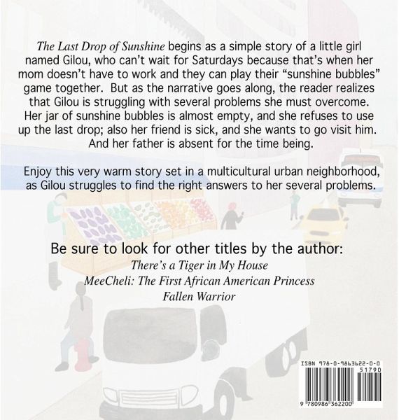 Guilou lives on the top floor of a large apartment building; from her bedroom window high in the sky she can hear the buzz of the city and the musical voices of her neighbors' accents of Haitian, Spanish, and German, as well as plain ol' English. The sounds of her neighborhood make her happy. On Saturdays Guilou is all smiles because her mother does not have to work, and she and her mother can play the "sunshine bubble" game. But when Guilou's bottle of sunshine bubbles is nearly empty, she decides to hide the last drop away and save it forever. Things are starting to pile up on Guilou. She's worried about her father's absence and her mother's working hard all week. Her good friend is sick, and she doesn't know how to cheer him up, and now this--her "sunshine bubbles" are almost gone. Join Guilou as she learns that helping others is sometimes the best way to help yourself.