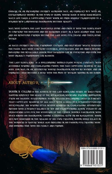 -A fantastical realm where the magic of The Wizarding World meets the exciting quests of Percy Jackson!Embark on an enchanting journey alongside Max, who resides in the small and ordinary town of Gilden, where magic and fairytales are mere make-believe. Max's life takes a captivating twist when he is transported to a strange new land-where imagination becomes reality. As he navigates this fantastical realm, Max discovers not only the existence of magic but unlocks his mage abilities, setting the stage for an adventure like no other. Max must gather the last Watcher's Stone and unite it with the Elder Staff to confront The Defeated and his Darkened Army. In a race against time, Max and his newfound friends become the last hope for Chiaro and their home world. As Max's journey unfolds, friendship, courage, and self-belief weave through the pages. Max must confront external adversaries and his inner demons, imparting the invaluable lesson that darkness can be overcome and even the most unlikely friendships can blossom."The Last Elder King" is a spellbinding middle-grade portal fantasy. With accessible writing and exhilarating twists, this tale captivates readers of all ages. Join Max on an adventure where imagination knows no bounds, and an ordinary child becomes a hero with the fate of worlds resting in his hands. -Discover The Last Elder King - The Watcher's Stone, a thrilling adventure that will captivate everyone's imagination. This extraordinary tale is crafted in a refreshingly straightforward style, making it accessible to readers of all ages. Get ready to embark on an unforgettable journey that will leave you yearning for more. Join us and unlock the gateway to an extraordinary adventure that will unite friends and bring joy to all!