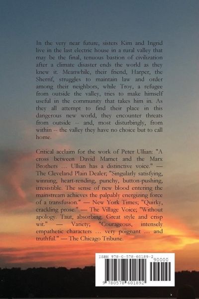 In the very near future, sisters Kim and Ingrid live in the last electric house in a rural valley that may be the final, tenuous bastion of civilization after a climate disaster ends the world as they knew it. Meanwhile, their friend, Harper, the Sherrif, struggles to maintain law and order among their neighbors, while Troy, a refugee from outside the valley, tries to make himself useful in the community that takes him in. As they all attempt to find their place in this dangerous new world, they encounter threats from outside -- and, most disturbingly, from within -- the valley they have no choice but to call home. Critical acclaim for the work of Peter Ullian: "A cross between David Mamet and the Marx Brothers … Ullian has a distinctive voice." - The Cleveland Plain Dealer; "Singularly satisfying, winning, heart-rending, punchy, button-pushing, irresistible. The sense of new blood entering the mainstream achieves the palpably energizing force of a transfusion." - New York Times; "Quirky, crackling prose." - The Village Voice; "Without apology. Taut, absorbing. Great style and crisp wit." - Variety; "Courageous, intensely empathetic characters … very poignant … and truthful." - The Chicago Tribune.