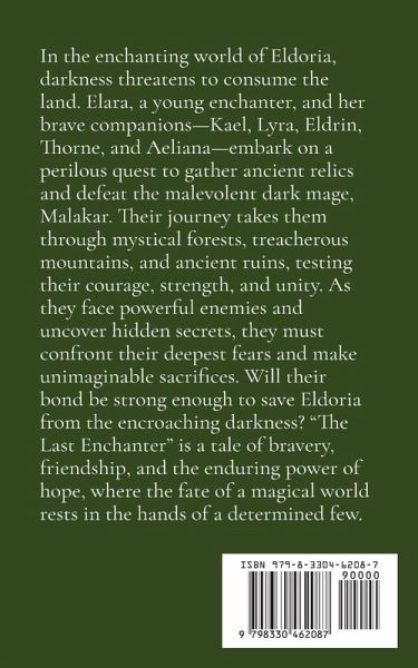 In the enchanting world of Eldoria, darkness threatens to consume the land. Elara, a young enchanter, and her brave companions-Kael, Lyra, Eldrin, Thorne, and Aeliana-embark on a perilous quest to gather ancient relics and defeat the malevolent dark mage, Malakar. Their journey takes them through mystical forests, treacherous mountains, and ancient ruins, testing their courage, strength, and unity. As they face powerful enemies and uncover hidden secrets, they must confront their deepest fears and make unimaginable sacrifices. Will their bond be strong enough to save Eldoria from the encroaching darkness? "The Last Enchanter" is a tale of bravery, friendship, and the enduring power of hope, where the fate of a magical world rests in the hands of a determined few.