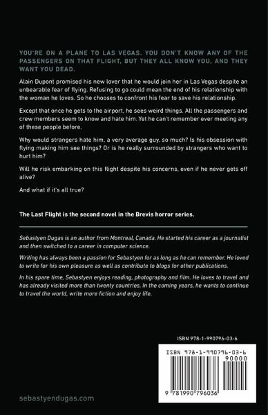 You're on a plane to Las Vegas. You don't know any of the passengers on that flight, but they all know you, and they want you dead. Alain Dupont promised his new lover that he would join her in Las Vegas despite an unbearable fear of flying. Refusing to go could mean the end of his relationship with the woman he loves. So he chooses to confront his fear to save his relationship. Except that once he gets to the airport, he sees weird things. All the passengers and crew members seem to know and hate him. Yet he can't remember ever meeting any of these people before. Why would strangers hate him, a very average guy, so much? Is his obsession with flying making him see things? Or is he really surrounded by strangers who want to hurt him? Will he risk embarking on this flight despite his concerns, even if he never gets off alive? And what if it's all true? The Last Flight is the second novel in the Brevis horror series