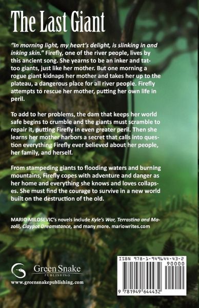 "In morning light/my heart's delight/is slinking in/and inking skin." Firefly, one of the river people, lives by this ancient song. She yearns to be an inker and tattoo giants, just like her mother. But one morning a rogue giant kidnaps her mother and takes her up to the plateau, a dangerous place for all river people. Firefly attempts to rescue her mother, putting her own life in peril. To add to her problems, the dam that keeps her world safe begins to crumble and the giants must scramble to repair it, putting Firefly in even greater peril. Then she learns her mother harbors a secret that calls into question everything Firefly ever believed about her people, her family, and herself. From stampeding giants to flooding waters and burning mountains, Firefly copes with adventure and danger as her home and everything she knows and loves collapses. She must find the courage to survive in a new world built on the destruction of the old.