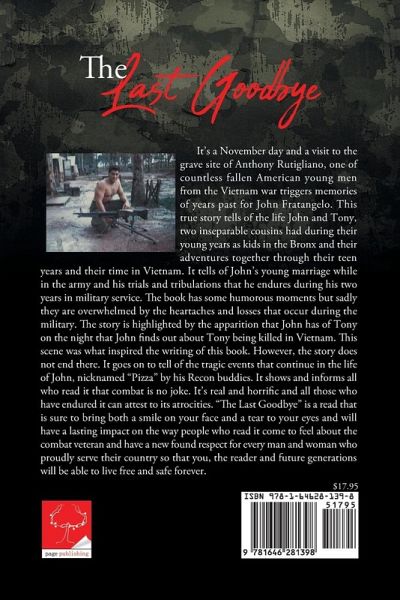 It's a November day and a visit to the grave site of Anthony Rutigliano, one of countless fallen American young men from the Vietnam war triggers memories of years past for John Fratangelo. This true story tells of the life John and Tony, two inseparable cousins had during their young years as kids in the Bronx and their adventures together through their teen years and their time in Vietnam. It tells of John's young marriage while in the army and his trials and tribulations that he endures during his two years in military service. The book has some humorous moments but sadly they are overwhelmed by the heartaches and losses that occur during the military. The story is highlighted by the apparition that John has of Tony on the night that John finds out about Tony being killed in Vietnam. This scene was what inspired the writing of this book. However, the story does not end there. It goes on to tell of the tragic events that continue in the life of John, nicknamed "Pizza" by his Recon buddies. It shows and informs all who read it that combat is no joke. It's real and horrific and all those who have endured it can attest to its atrocities. "The Last Goodbye" is a read that is sure to bring both a smile on your face and a tear to your eyes and will have a lasting impact on the way people who read it come to feel about the combat veteran and have a new found respect for every man and woman who proudly serve their country so that you, the reader and future generations will be able to live free and safe forever.