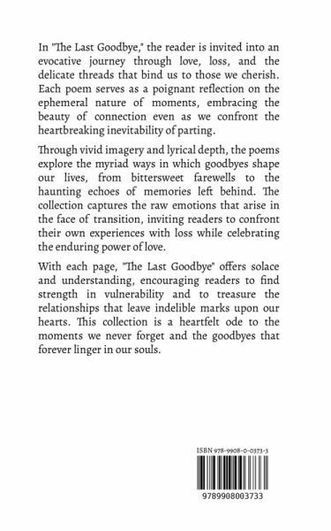 In "The Last Goodbye," the reader is invited into an evocative journey through love, loss, and the delicate threads that bind us to those we cherish. Each poem serves as a poignant reflection on the ephemeral nature of moments, embracing the beauty of connection even as we confront the heartbreaking inevitability of parting. Through vivid imagery and lyrical depth, the poems explore the myriad ways in which goodbyes shape our lives, from bittersweet farewells to the haunting echoes of memories left behind. The collection captures the raw emotions that arise in the face of transition, inviting readers to confront their own experiences with loss while celebrating the enduring power of love. With each page, "The Last Goodbye" offers solace and understanding, encouraging readers to find strength in vulnerability and to treasure the relationships that leave indelible marks upon our hearts. This collection is a heartfelt ode to the moments we never forget and the goodbyes that forever linger in our souls.