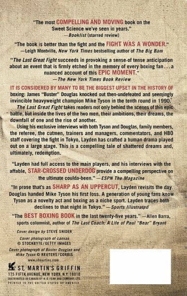 Meticulously researched, wonderfully written; The Last Great Fight tells the untold story of a legendary fight and the two warriors who would never be the same again It is considered by many to be the biggest upset in the history of boxing: James "Buster" Douglas knocked out then-undefeated Heavyweight Champion Mike Tyson in the 10th round in 1990 when the dominating and intimidating Tyson was considered invincible. The Last Great Fight takes readers not only behind the scenes of this epic battle, but inside the lives of two men, their ambitions, their dreams, the downfall of one and the rise of another. Using his exclusive interviews with both boxers Tyson and Douglas, family members, the referee, the cutmen, trainers and managers to the commentators and HBO staff covering the fight in Tokyo, Joe Layden has crafted a human drama played out on a large stage. This is a compelling tale of shattered dreams and, ultimately, redemption.