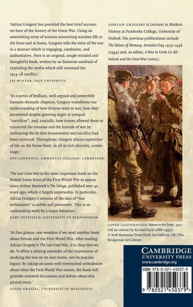 What was it that the British people believed they were fighting for in 1914-18? This compelling history of the British home front during the First World War offers an entirely new account of how British society understood and endured the war. Drawing on official archives, memoirs, diaries and letters, Adrian Gregory sheds new light on the public reaction to the war, examining the role of propaganda and rumour in fostering patriotism and hatred of the enemy. He shows the importance of the ethic of volunteerism and the rhetoric of sacrifice in debates over where the burdens of war should fall as well as the influence of religious ideas on wartime culture. As the war drew to a climax and tensions about the distribution of sacrifices threatened to tear society apart, he shows how victory and the processes of commemoration helped create a fiction of a society united in grief.