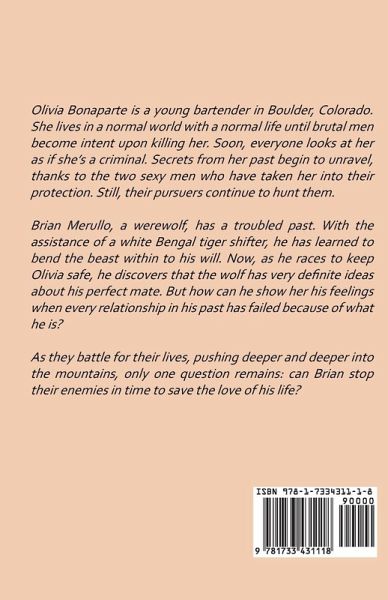 Olivia Bonaparte is a young bartender in Boulder, Colorado. She lives in a normal world with a normal life until brutal men become intent upon killing her. Soon, everyone looks at her as if she’s a criminal. Secrets from her past begin to unravel, thanks to the two sexy men who have taken her into their protection. Still, their pursuers continue to hunt them. Brian Merullo, a werewolf, has a troubled past. With the assistance of a white Bengal tiger shifter, he has learned to bend the beast within to his will. Now, as he races to keep Olivia safe, he discovers that the wolf has very definite ideas about his perfect mate. But how can he show her his feelings when every relationship in his past has failed because of what he is? As they battle for their lives, pushing deeper and deeper into the mountains, only one question remains: can Brian stop their enemies in time to save the love of his life?