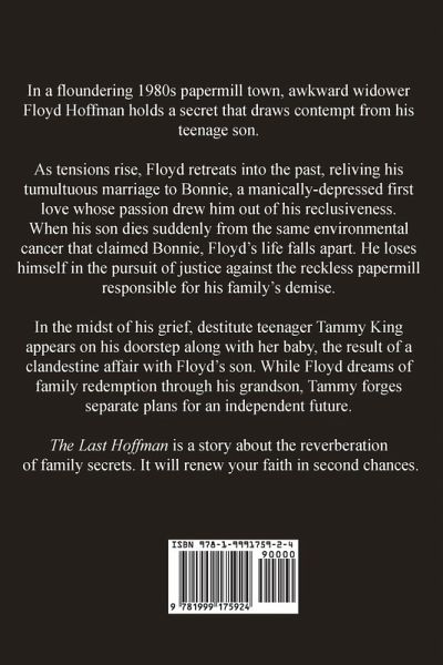 In a floundering 1980s papermill town, awkward widower Floyd Hoffman holds a secret that draws contempt from his teenage son. As tensions rise, Floyd retreats into the past, reliving his tumultuous marriage to Bonnie, a manically-depressed first love whose passion drew him out of his reclusiveness. When his son dies suddenly from the same environmental cancer that claimed Bonnie, Floyd's life falls apart. He loses himself in the pursuit of justice against the reckless papermill responsible for his family's demise. In the midst of his grief, destitute teenager Tammy King appears on his doorstep along with her baby, the result of a clandestine affair with Floyd's son. While Floyd dreams of family redemption through his grandson, Tammy forges separate plans for an independent future. The Last Hoffman is a story about the reverberation of family secrets. It will renew your faith in second chances.
